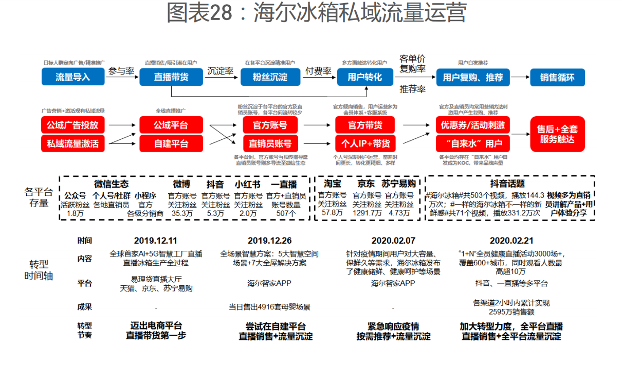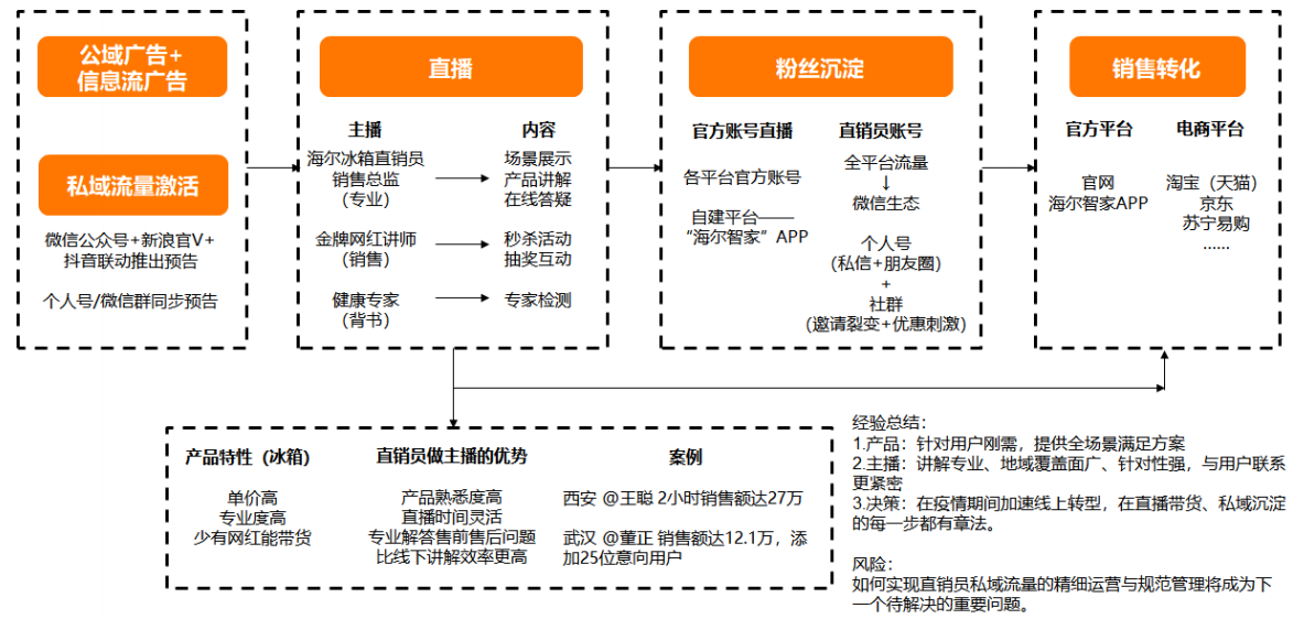 尽管海尔冰箱线下渠道强势,2019年12月起,海尔冰箱适时而变加速线上直播电商布局,结合了原电视销售(直销员带货/专家介绍背书)+”网红带货”,打造了”直销员+网红+专家”直播模式,一步到位满足用户的购物心理。