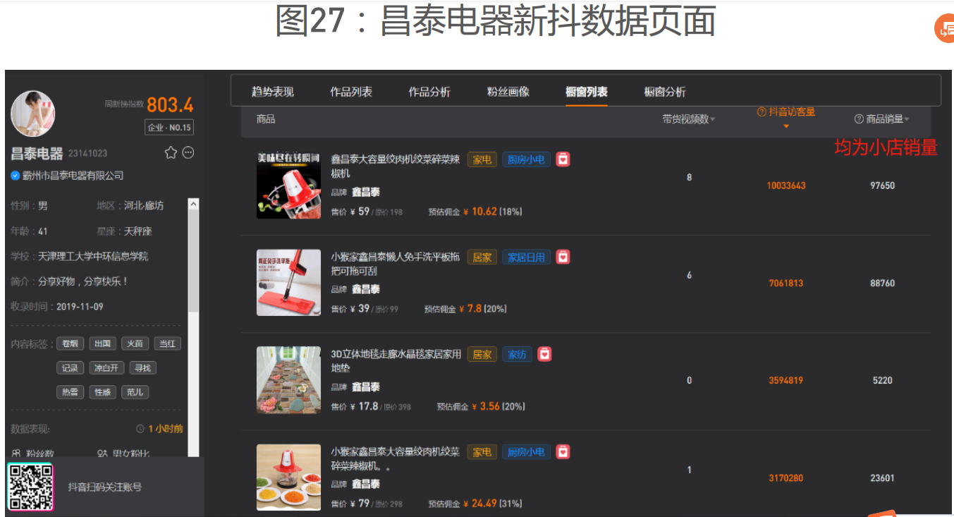 2月份企业带货视频点赞量最高的是注册信息为霸州市昌泰电器有限公司的“鑫昌泰”品牌,这是一个典型的“白牌”。百度搜索这家企业,只有注册信息,没有任何推广稿件;淘宝平台中也没有同品牌店铺。如果在电商营销、新媒体公域营销中,这个品牌是没有任何优势的,无法与小熊电器、新宝电器等小家电品牌竞争。但这个品牌能在抖音平台上获得几十万的访客数,其爆款绞肉机在抖音小店实现了7万多的销售量。