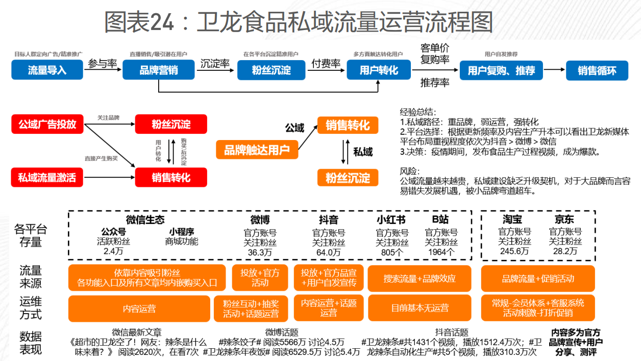虽然品牌势能强,但卫龙也非常注重私域的沉淀,其在抖音、微博、微信上均进行了精致的内容运营,根据平台特征和传播规律制作轻松有趣,同时导购属性鲜明的内容,以实现粉丝的留存与复购。对于依赖于公域营销的快消品牌,可参考卫龙的做法。以“强公弱私”建设模式,强化内容运营。