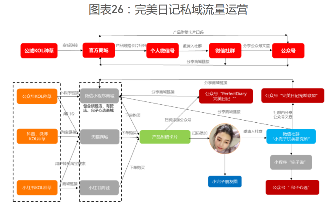 完美日记针对“年轻女性“这一用户群,在微信、微博、抖音、小红书等平台上,投放大量的KOL和KOC进行产品种草,引导用户进入商城购买。用户在消费后,通过产品附赠的卡片可以添加客服,进入完美日记的微信生态。完美日记在私域运营上,建立了公众号矩阵,同时开设了海量的“小完子”客服号和社群。企业可以通过公众号、社群、“小完子”朋友圈等向粉丝推送美妆教程和产品优惠,引导其进入小程序商城购买。通过社群和客服号,粉丝也可以随时交流和咨询产品的相关问题。在微信生态中,通过内容和社群的运营,用户对品牌的忠诚度不断提升,用户长期价值得到不断提升。